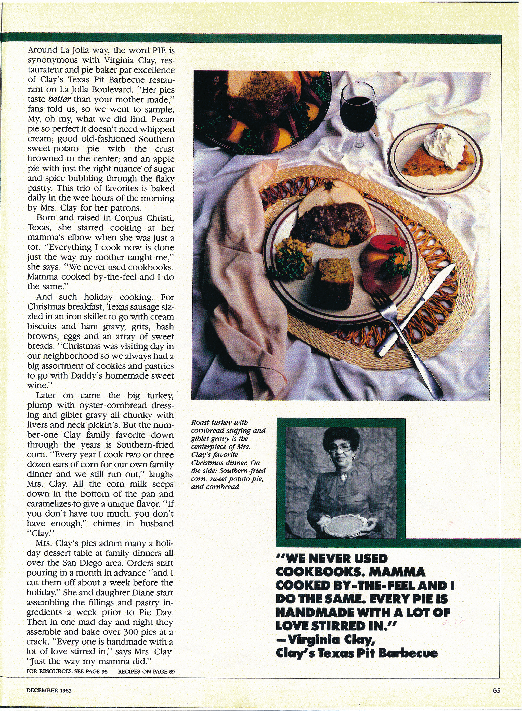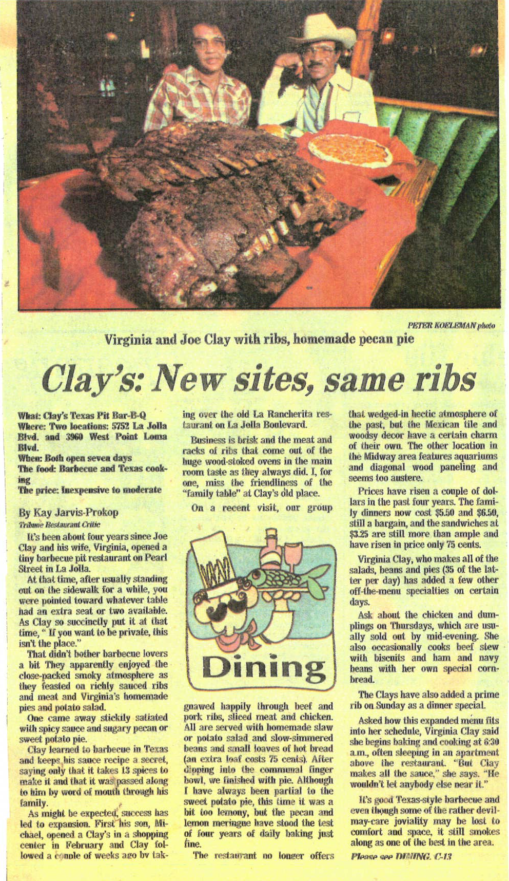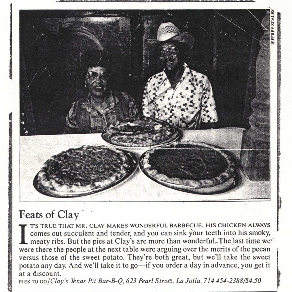 In 1977, the Clays relocated to La Jolla, California and opened the “Clay’s Texas Pit BBQ” restaurant - the first BBQ joint in La Jolla’s exclusive beachside community. Their tiny place with booths and one long community table garnered many awards including "Best of San Diego" by The Reader and was often featured in "Best Bets" on local television. Clay's Texas Pit BBQ was voted "Best BBQ" by San Diego Magazine, and noted by the Los Angeles Times in a feature article.