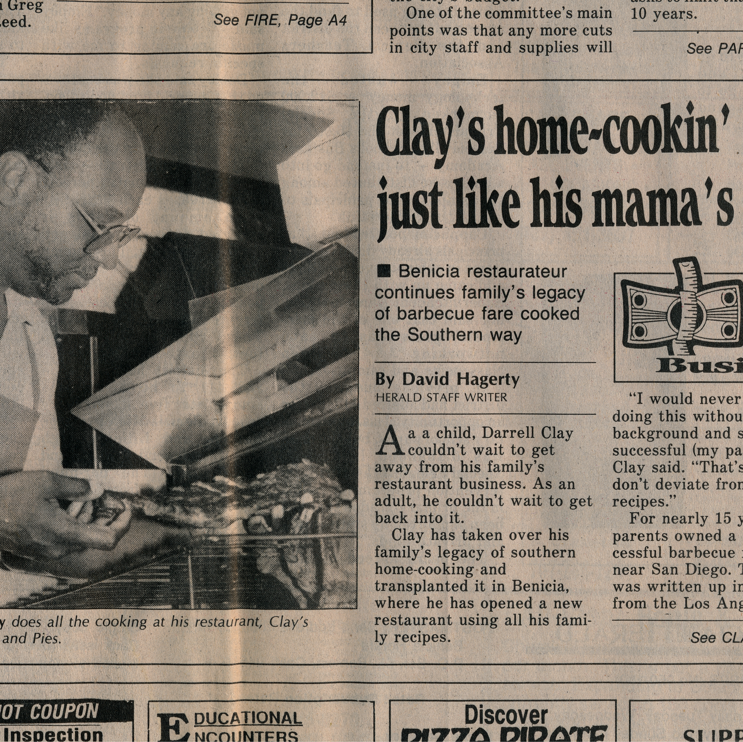 Between 1980 and 2001, Joe and Ginnie’s sons Darrell and Michael Clay each started and ran their own successful Clay’s BBQ restaurants in Southern California, including in the cities of Encinitas, Poway, San Diego, and the city of Benicia in the San Francisco Bay Area. Darrell then continued offering the Clay’s ribs and smoked meats in the form of a catering business until around 2010, after which the Clay’s BBQ business officially came to a halt.